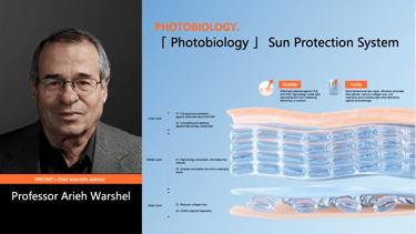 "Photobiology" sunscreen system provides targeted solutions by studying the damage of different wavelengths of sunlight to different depths of the skin, from the epidermal layer, to the cellular layer, to the dermal layer. Not only does it provide sun protection, but it also repairs unseen light damage to the deeper layers of the skin, effectively "stifling" photodamage at its inception.