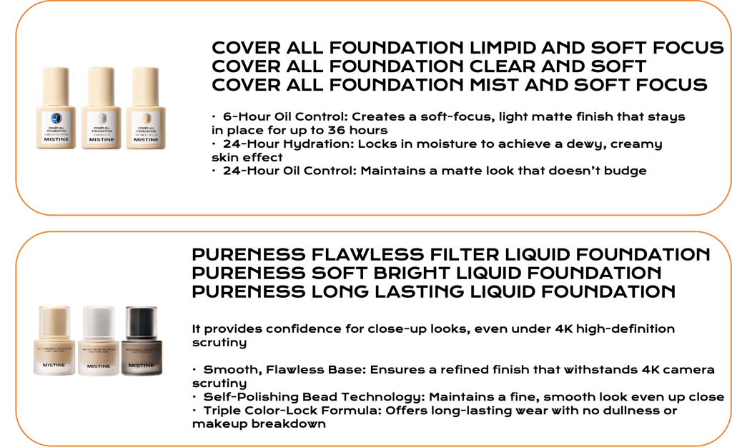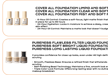 The 4K Series Foundation is designed with an ultra-fine texture that applies smoothly without any grainy feel, adhering seamlessly to the skin for an even, natural complexion. It provides confidence for close-up looks, even under 4K high-definition scrutiny.