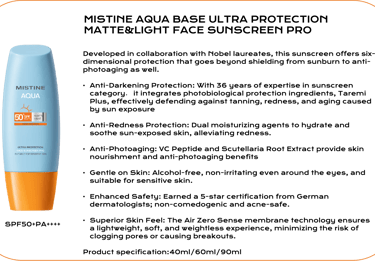 Mistine collaborates with Nobel laureates to innovate six-dimensional sun protection that not only shields against UV rays but also anti-photoaging. With 36 years of expertise in sunscreen category, it integrates photobiological protection ingredients, Taremi Plus, effectively defending against tanning, redness, and aging caused by sun exposure. A dual moisturizing system soothes post-sun redness, while VC Peptide and Scutellaria Root Extract provide skin nourishment and anti-photoaging benefits. The gentle, alcohol-free formula is sensitive-skin friendly and has earned a 5-star certification from German dermatologists. The Air Zero Sense membrane technology ensures a lightweight, soft, and weightless experience, minimizing the risk of clogging pores or causing breakouts.